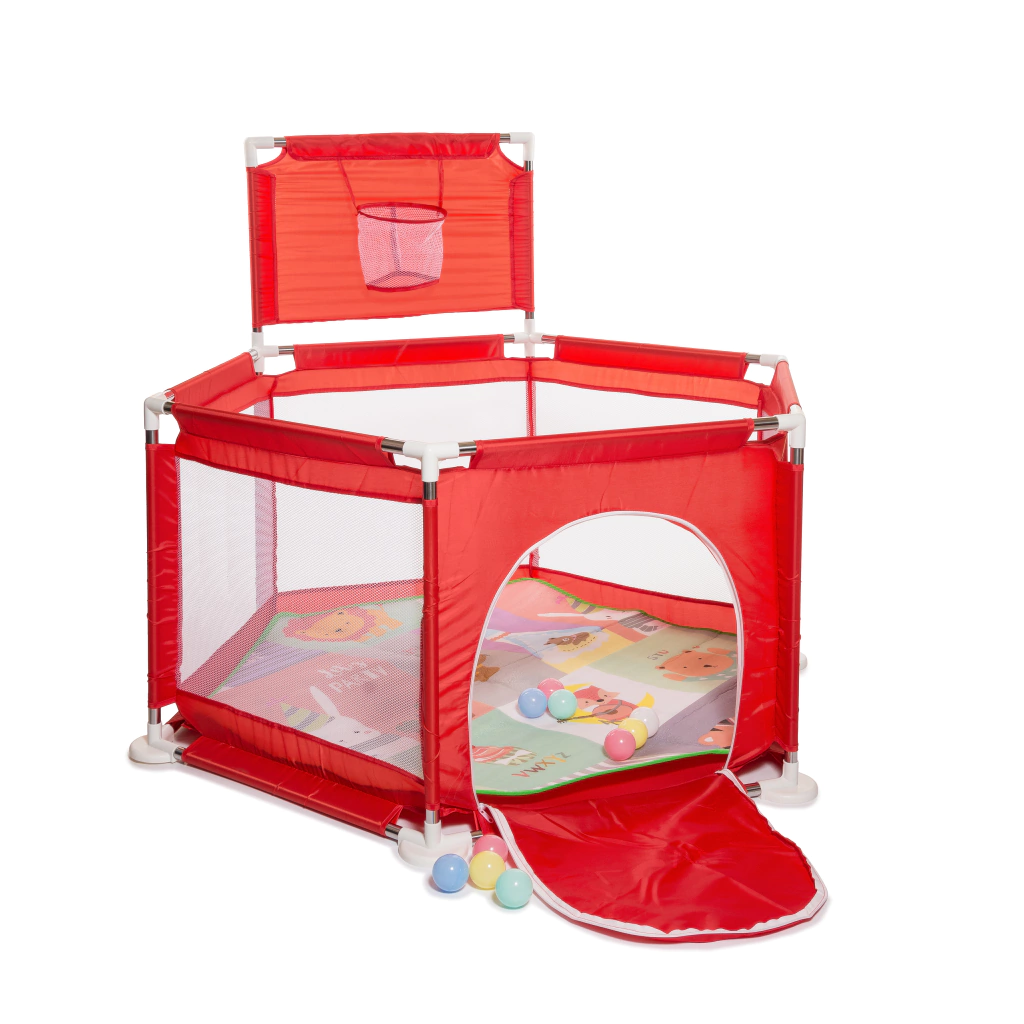 • Corralito hexagonal. • Desarmable. • Encastrable. • Con pelotas, aro de básquet y una alfombra con diseños. • 137 cm de ancho x 121 cm de profundidad x 103 cm de alto.