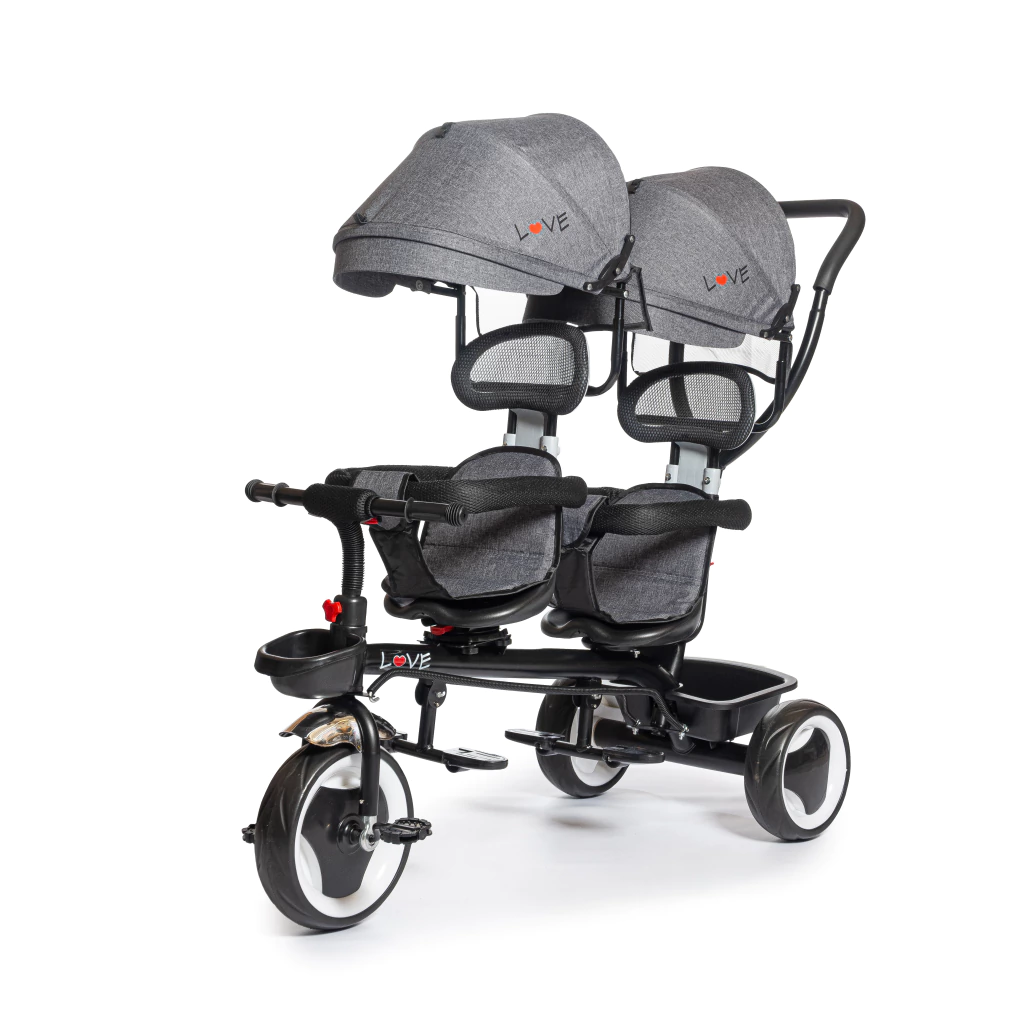 • Guiador con bolsillo porta objetos, doble capota, canasto delantero y trasero.